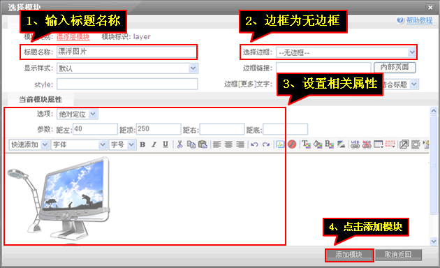 ”,通过设置参数调整漂浮内容的位置,漂浮内容可以自由编辑。